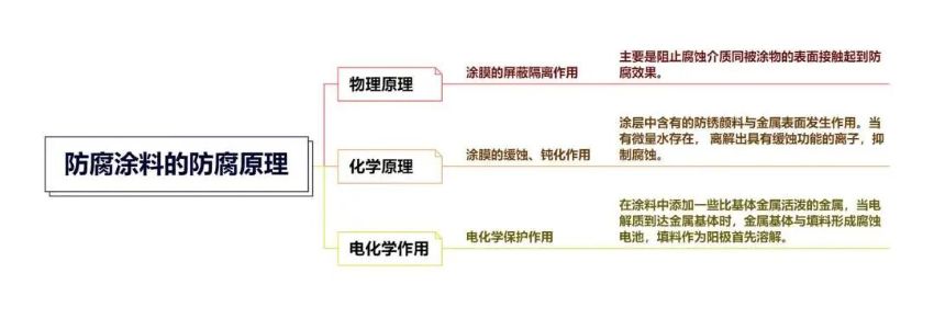 防腐涂料的防腐原理主要包括三个方面:物理原理、化学原理和电化学作用。其特点如图所示。