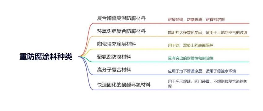 根据重防腐的具体用途和作用分类,主要有复合陶瓷高温防腐材料、环氧树脂复合防腐材料、陶瓷填充涂层材料、快速固化的酚醛环氧材料、高分子复合材料以及聚氨酯防腐材料。