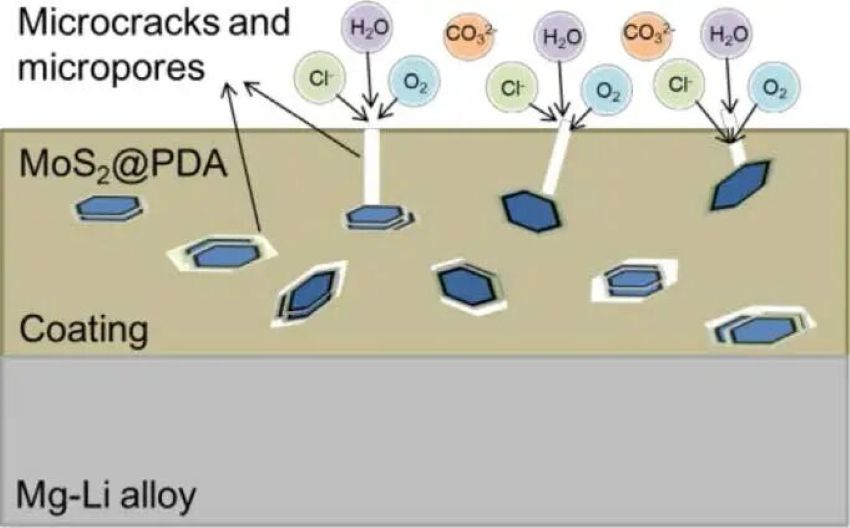 3.粉末防腐蚀涂料:具备无公害的特点,该项技术以无溶剂为基础,涂抹到厚涂层中,再回收喷溢的涂料,使粉末防腐蚀涂料喷溢的部分可回收再利用。环氧树脂粉末涂层已成功应用于镁锂合金的防腐,但其耐磨性差,凝固过程中形成微裂纹,限制了其广泛应用。Chen等采用熔融挤出法制备了聚多巴胺改性二硫化钼环氧树脂粉末涂料(MoS2@PDA-EP粉末涂料),通过MoS2特殊的二维层状结构填充粉末涂层中的微裂纹,阻挡腐蚀性介质的侵入。