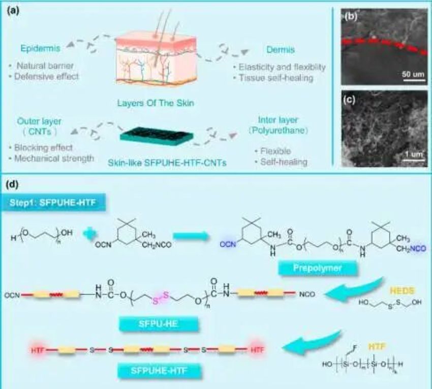 1.无溶剂防腐蚀涂料:无溶剂防腐蚀涂料具有不含挥发性的特点, 涂料的组成成分可以全部成膜,所以避免了对环境的污染,以及因为溶剂挥发不完全而造成的气孔问题,在涂膜干燥以后,涂料的收缩率降低,其致密性较强,涂膜的厚度可以达到200300μm,减少了繁琐的施工流程,施工的效率得到大幅的提升。Kong等构建了具有皮肤样双层结构的自修复无溶剂聚氨酯/碳纳米管复合材料(SFPUHE-HTF-CNTs)SFPUHE-HTF-CNTs由两层组成,即含有二硫键和含氟聚硅氧烷链段的无疏水溶剂聚氨酯(SFPUHE-HTF)和含有防腐蚀层的导电性良好的CNTs
