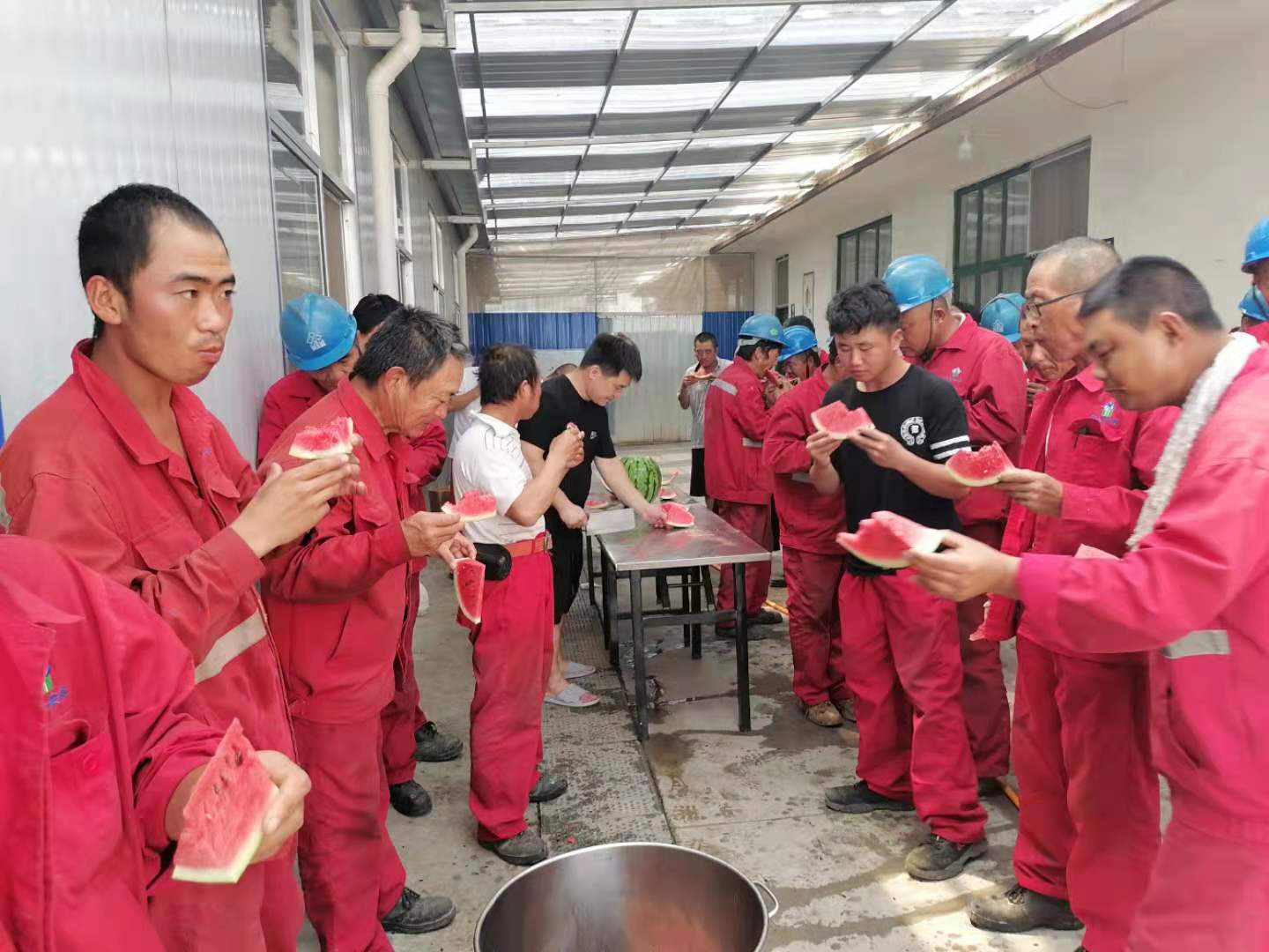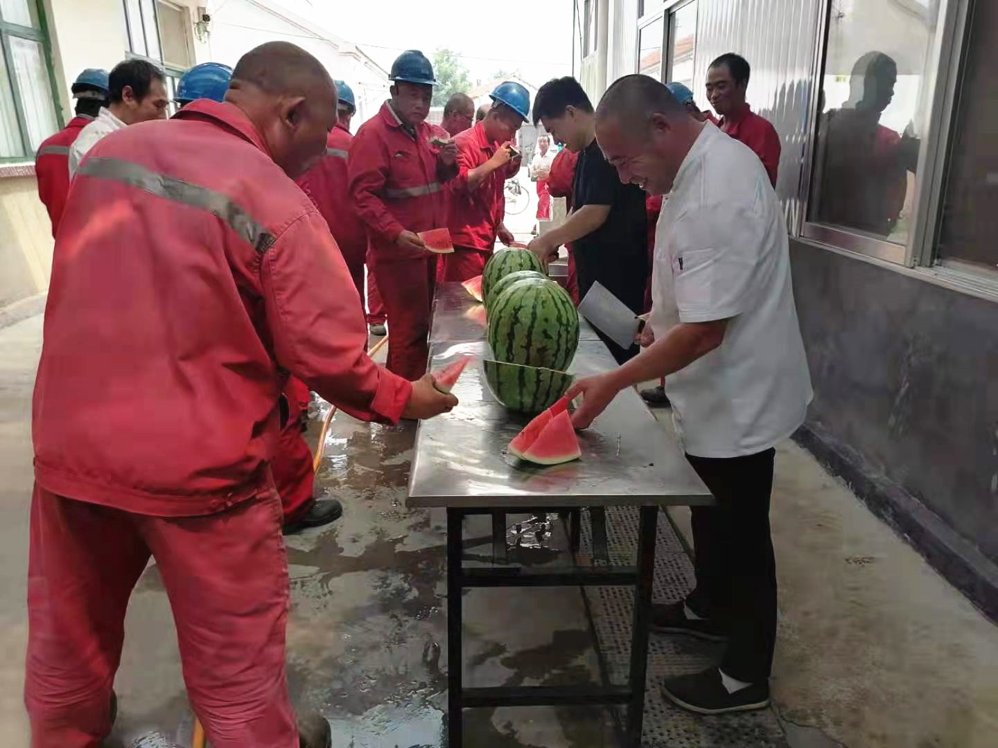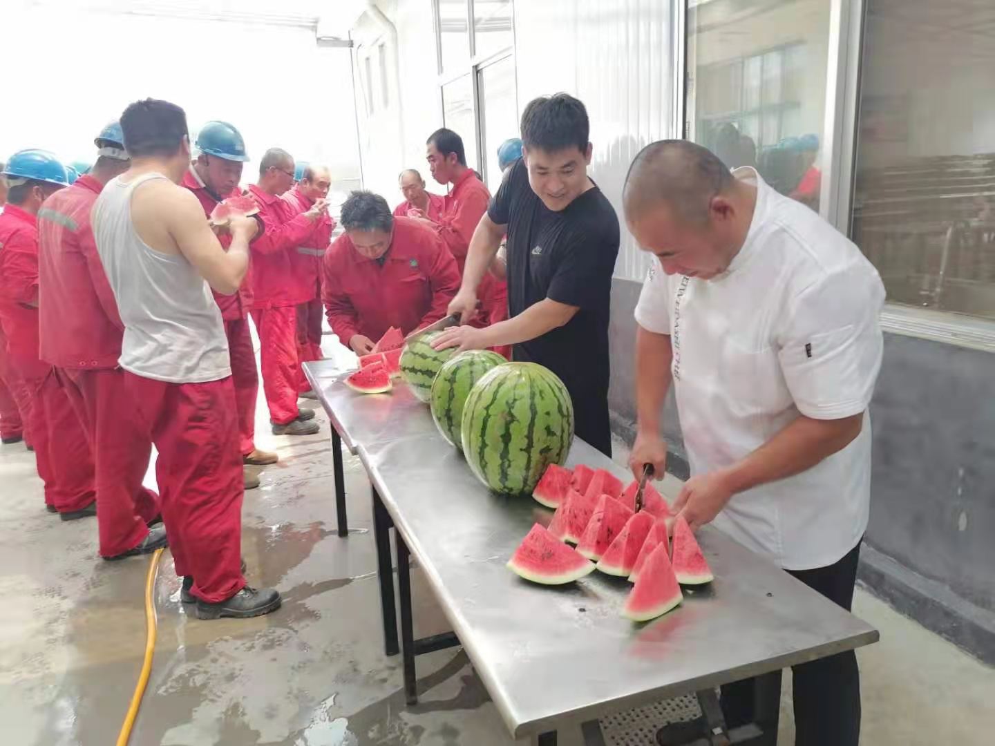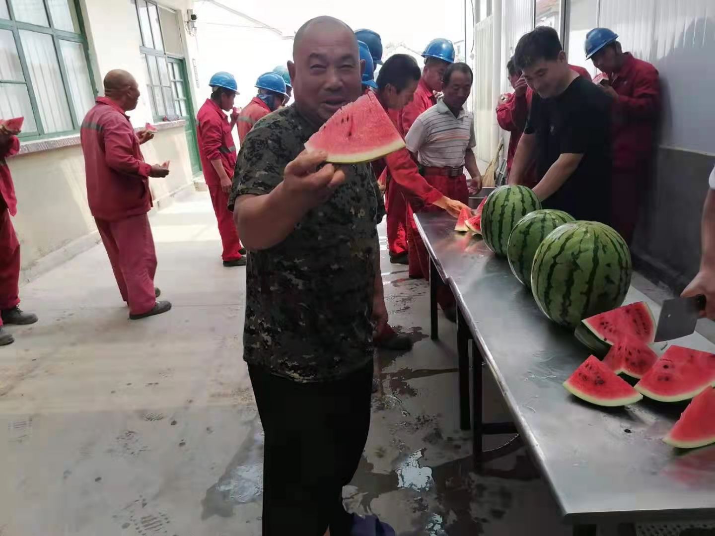 极大地鼓舞了一线工作人员的士气,在这样炎热的天气下,上岗前吃到冰甜的西瓜,既解暑又贴心。