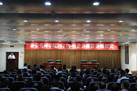 第二阶段:校企共建暨捐赠仪式。泰安技师学院院长贾军同志发表致辞。他指出,校企合作培养的学生,既有扎实的理论知识基础,又掌握了与岗位能力要求相匹配的专业技能,获得了社会的广泛认可和用人单位的高度评价。因此,校企合作是培养高素质技能型人才,实现职业教育又好又快发展的根本途径。