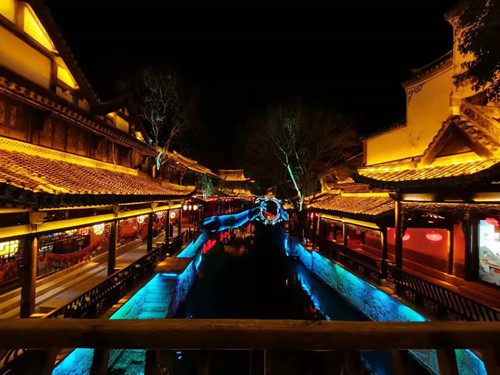 夜幕降临,数千盏各类彩灯将台儿庄古城装扮得流光溢彩,水巷、石桥、亭阁楼台在灯光下如诗如画,到处洋溢着浓浓的节日氛围。