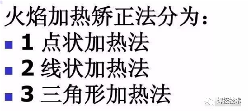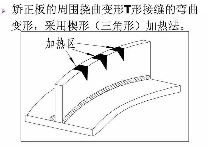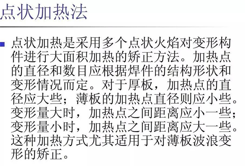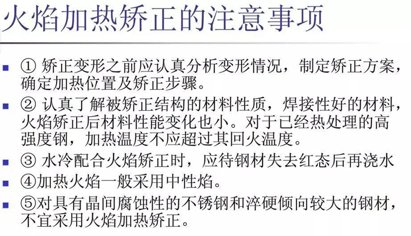 即利用不均匀的加热使结构获得反向的变形来补偿或抵消原来的焊接变形。加热矫正法的加热方法可分为点状加热、线状加热、三角形加热。加热矫正能消除很多施力矫正无法解决的变形,掌握火焰局部加热引起的变形的规律是做好矫正的关键,决定火焰矫正效果主要是加热的位置和加热温度。低碳钢和普通合金的焊接结构通常采用650~8000C的加热温度,一般不宜超过9000C。参见表2各种颜色可判别温度范围