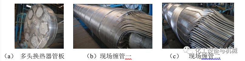 为节省设备投资,在有限换热器壳体容积中,布置最大换热管传热面积,提高换热效率,管壳式缠绕管换热器(图16)应运而生。此类换热器为多层多头在芯棒上缠绕焊接不锈钢小直径换热管,结构如图16所示。