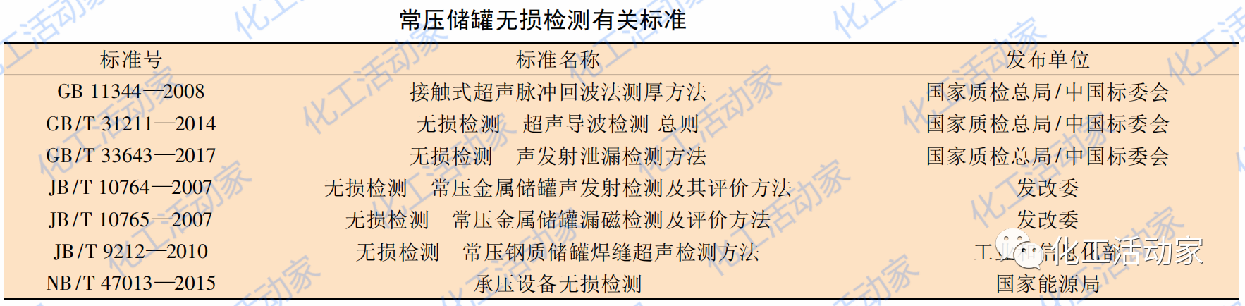 常压储罐的导波检测、漏磁检测、超声检测和声发射检测可以参考国家标准或者机械行业标准,而磁粉检测和渗透检测则可以参考NB/T 47013-2015《承压设备无损检测》标准。