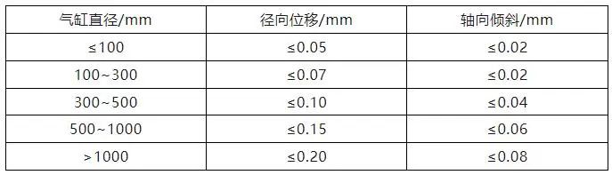 气缸轴线与中体滑道轴线的同轴度偏差,应符合下表中的规定。若超过规定时,应使气缸做水平或径向位移,或刮研连接止口进行调整,不得采用加偏垫或施加外力的方式进行调整。处理后的止口面,其接触面积应达到60%以上。调整气缸水平度,其偏差不得大于0.05 mm/m,且倾斜方向应与中体一致(高向气缸盖端),但必须符合下表中的规定。检查填料座轴线与气缸轴线的同轴度偏差,也应符合上述规定。