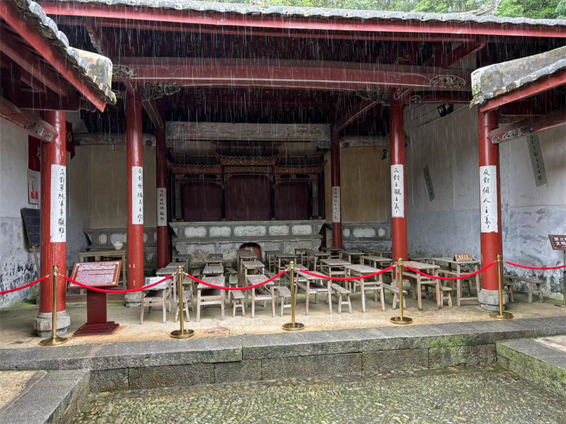 古田会议会场的陈设非常简单,两张八仙桌拼在一起就是讲台,几排长条凳摆放整齐就是坐席,厅前的廊柱上张贴着红军标语,地面石板上残留着炭火炙烤的痕迹。