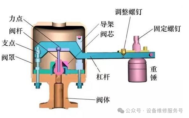 2.重锤式安全阀:利用重锤的重力来平衡介质压力,多用于大型锅炉。主要用于大型锅炉和蒸汽动力装置。