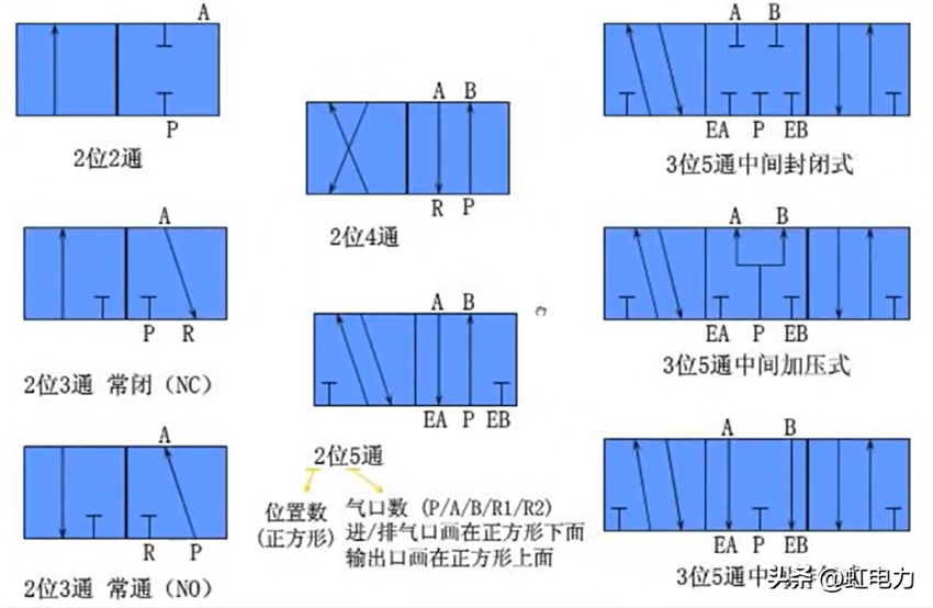 不同的“通”和“位”构成了不同类型的气动换向电磁阀。