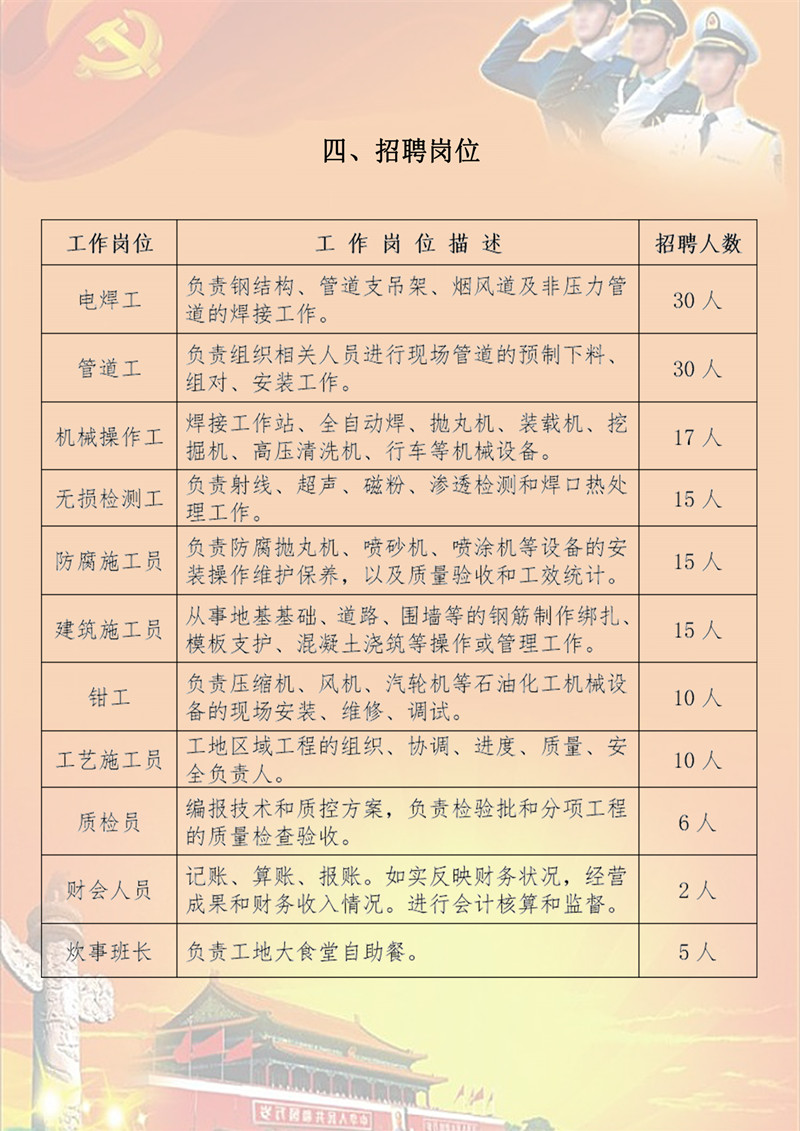 山东岱圣安装有限公司采用定向招聘、定向培训的方式,招聘155名退役军人。经面试合格,山东岱圣安装有限公司与退役军人签订定向就业意向书,退役军人带薪参加职业技能培训及岗位锻炼实践。参训退役军人经培训实践合格后,本着自愿原则,与山东岱圣安装有限公司签订劳动就业合同。