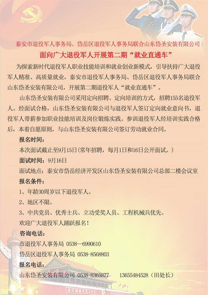 泰安市退役军人事务局、岱岳区退役军人事务局联合山东岱圣安装有限公司面向广大退役军人开展第二期“就业直通车”