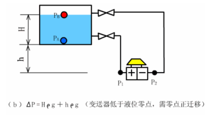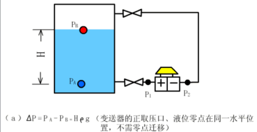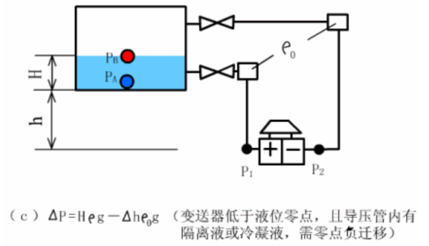 采用差压式液位计测量液位时,由于安装位置不同,一般情况下均会存在零点迁移的问题,有无迁移、正迁移和负迁移3种情况。