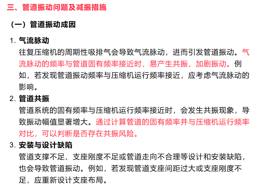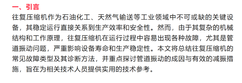 往复压缩机的故障诊断与管道减振是保障设备稳定运行的重要环节。通过对热力参数和机械部件的监测,可以及时发现并解决压缩机的常见故障。同时,针对管道振动问题,采取优化设计、安装缓冲装置和调整运行参数等措施,能够有效降低振动,延长设备寿命,保障生产安全。技术人员应结合实际工况,灵活运用这些方法,确保往复压缩机的高效运行。