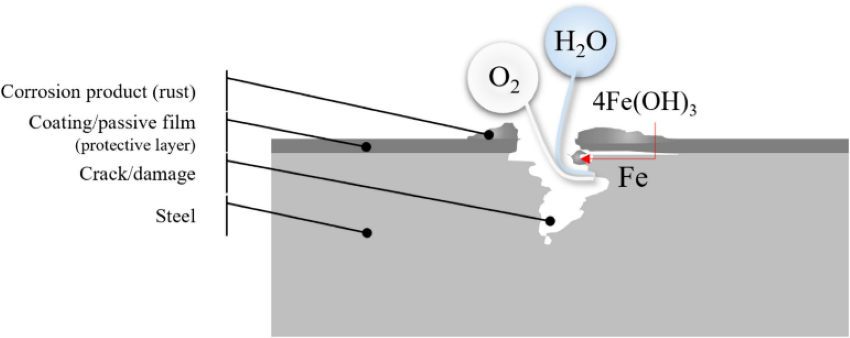 随后脱水形成我们熟悉的铁锈 Fe2O3·H2O。最初生成的氧化膜可能具有一定保护性,但随着时间推移,会逐渐演变为点蚀、裂纹和局部破坏,如图1所示。