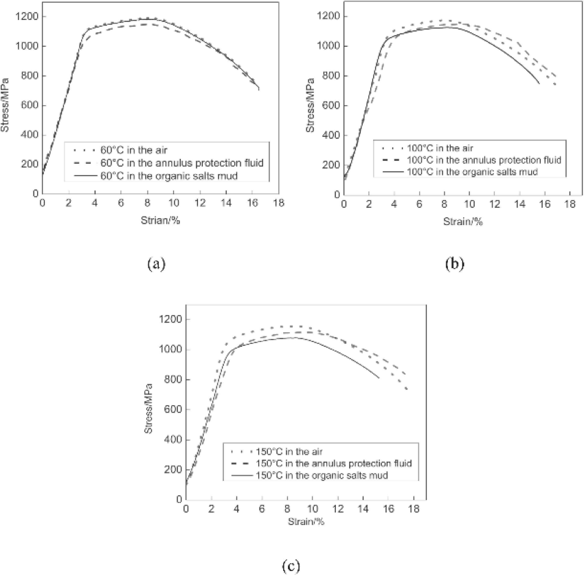 图2. 温度对不同溶液中应力-应变曲线的影响,在 (a) 60 °C、(b) 100 °C 和(c)150°C