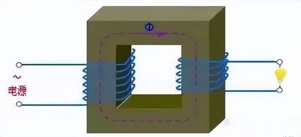 变压器由铁芯(或磁芯)和线圈组成,线圈有两个或两个以上的绕组,其中接电源的绕组叫初级线圈,其余的绕组叫次级线圈。它可以变换交流电压、电流和阻抗。最简单的铁心变压器由一个软磁材料做成的铁心及套在铁心上的两个匝数不等的线圈构成,如下图所示。
