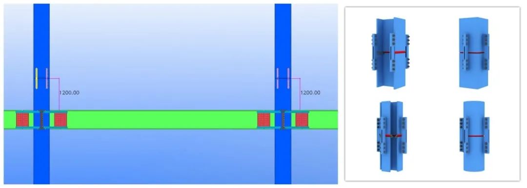 为方便焊接及焊缝检测,钢柱分段位置一般在楼层标高往上1.2m左右,同一项目钢柱对接连接板规格最好采用一种型号,最多不超过两种,方便材料重复利用。