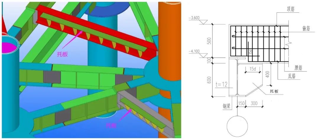 对于卫生间、设备间等需降板的位置,务必核对建筑图与结构图是否一致,若需降板,降板位置处钢梁需增设托板方可浇筑混凝土楼板。