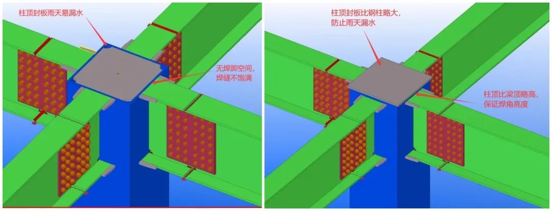 柱顶封板不宜做成内加劲的形式,宜比钢柱截面略大,可防止雨天漏水;此外柱顶标高应比梁顶高20-50mm,以保证梁柱连接上翼缘焊缝焊脚尺寸符合规范要求。