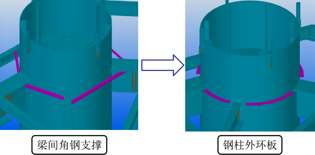 梁柱节点处一般采用角钢来支撑钢筋桁架楼承板,但是对于直径较大的圆管钢框柱,建议采用钢柱外环板,这样不仅使楼承板端部受力更为合理,而且还解决了楼板混凝土浇筑时漏浆的问题,进而保证了楼板混凝土的浇筑质量。