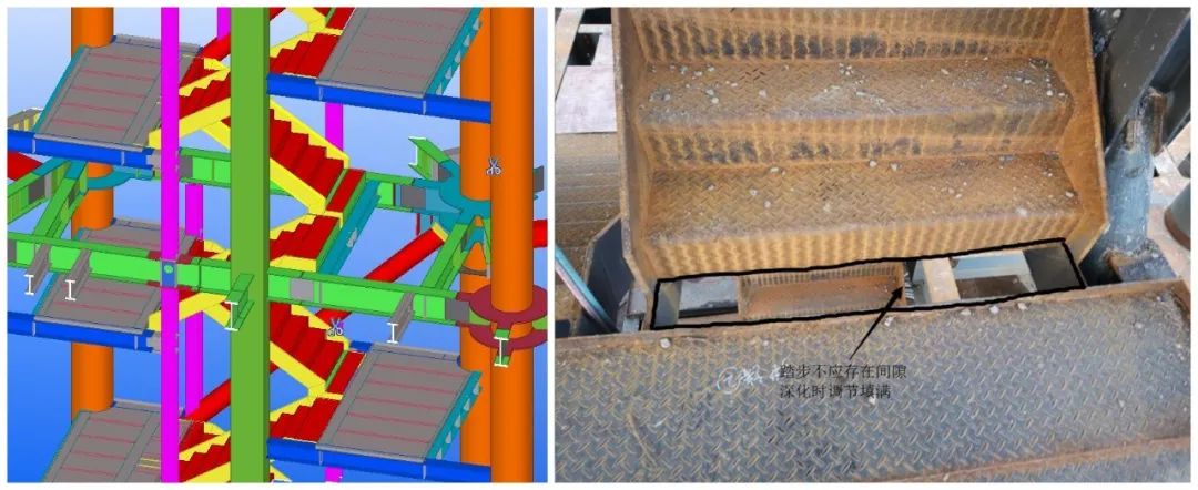 框架结构中楼梯多为钢楼梯,钢楼梯除需注意起跑方向、踏步高与宽、花纹面方向、楼梯外,还需注意起始踏步不应存在间隙。