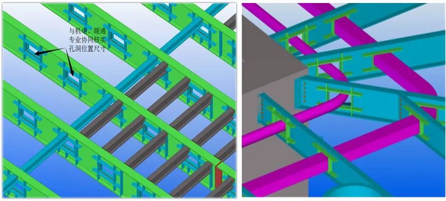 钢结构先于机电安装,机电洞口需先在钢梁上预留,为确保机电管线后续顺利安装,需提前核对洞口位置及尺寸,并按规范进行补强。