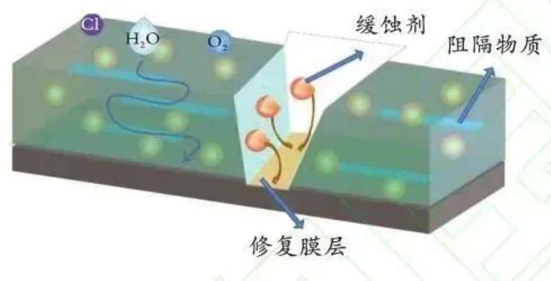 2)若要填料发挥作用,往往需要扩散通道将其转移到损伤部位,而这些通道恰恰也是腐蚀性介质的传输路径,该矛盾目前尚未得到很好的解决。此外,填料的修复大多是一次性的,当其释放殆尽,其修复功能随之消失,甚至留下空洞结构,削弱涂层的机械性能。涂层被修复后,其物理屏障性能并不能得到完全修复,甚至会比破损前更加脆弱,因此也应着力提高自修复后的屏障能力。