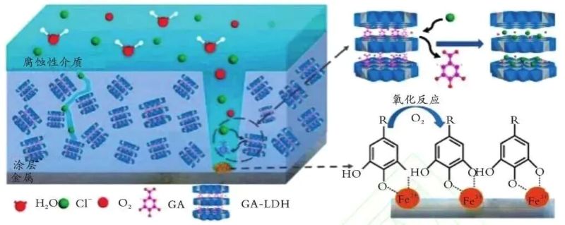 层状双氢氧化物(LDH)是一种具有离子交换性能的纳米容器,当涂层被破坏时可发生阴离子交换反应,将有害的腐蚀离子吸收并释放抑制离子。应用水滑石的离子交换能力,可向水滑石中添加缓蚀剂以赋予其自修复能力。在水滑石间插层的钨酸根和蛋氨酸(Met)离子可使Mg化合物在缺陷表面累积;被置换的MBT可释放MBT离子并与Fe2+发生反应,形成螯合物并吸附在碳钢表面;在水滑石中储存环境友好型没食子酸(GA)也可在捕获腐蚀性Cl-后释放没食子酸根离子作为螯合剂(见图3),达到有效保护金属基体的效果。