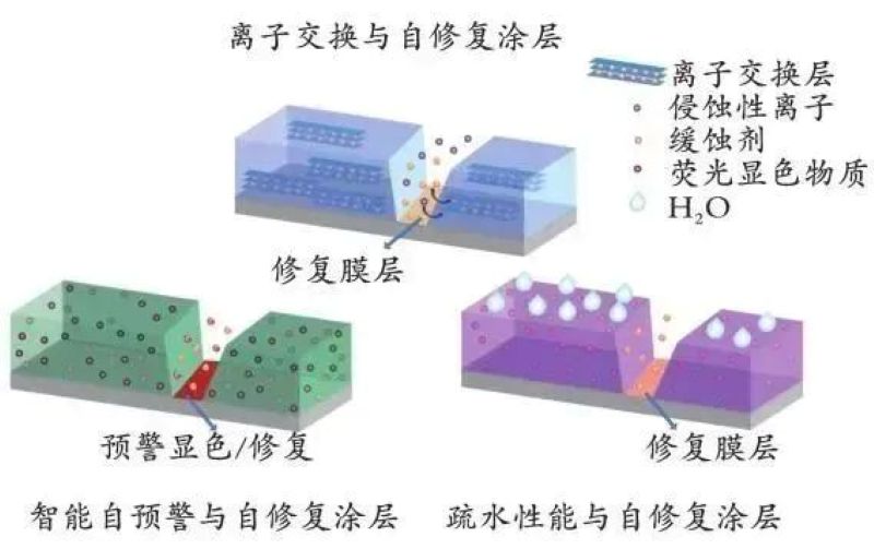 为了打破传统防腐涂料的局限,受最初的阻隔/自修复防腐涂层的启发,研究人员设计了其他新型防腐涂料,并利用各种物质本身的不同属性制备了兼具不同性能和自修复的双功能防腐涂层(见图2)。其性能包括离子交换、智能自预警和疏水能力。