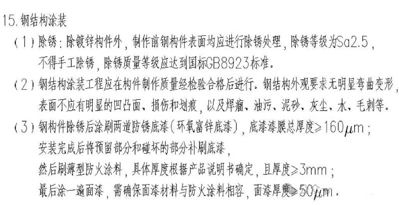 当没有防火要求时,涂装做法一般是两道底漆+一道中间漆+一道面漆,当有防火要求时,涂装做法一般是两道底漆+防火涂料+一道面漆。而防火涂料分为薄型(膨胀型)和厚型两种做法,薄型涂料的厚度一般根据产品说明书确定(通常在2-5mm范围),厚型涂料的厚度根据防火计算结果确定(通常钢柱在25mm以上,钢梁在20mm以上),当采用薄型防火涂料时,由于涂层整体厚度较薄,总厚度跟没有防火涂料时接近,此时就要适当加厚底漆和面漆,而采用厚型防火涂料时,可以适当减薄底漆和面漆。我个人的常见做法如下: