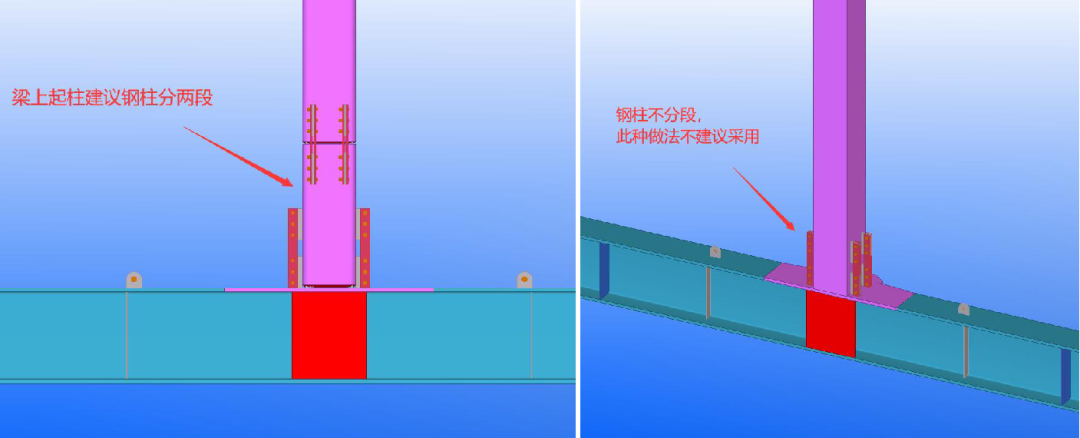 对于梁上起柱节点,若钢柱较高,不建议采用钢柱不分段、现场定位焊接的方法,原因一是钢柱定位后往往不会马上焊接,钢柱需用缆风绳固定牢靠,否则有倾覆的风险;二是较高的钢柱现场不好安装定位,若定位有误差返工量较大。