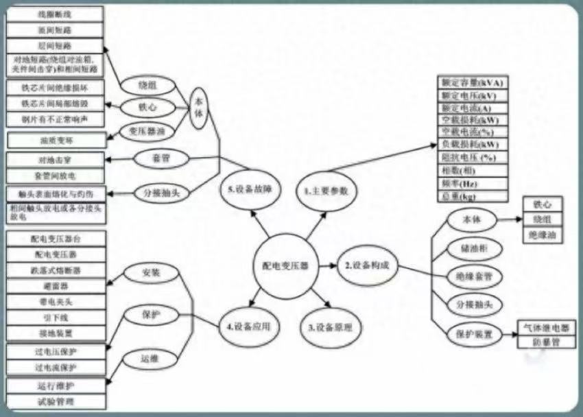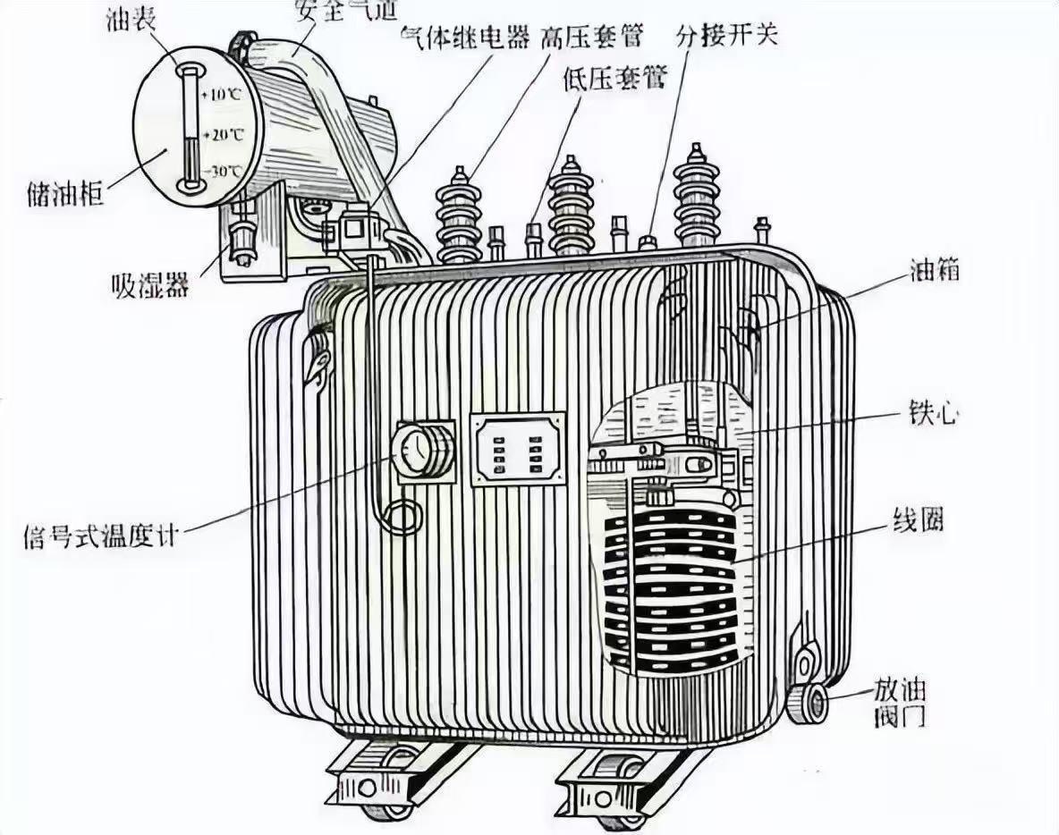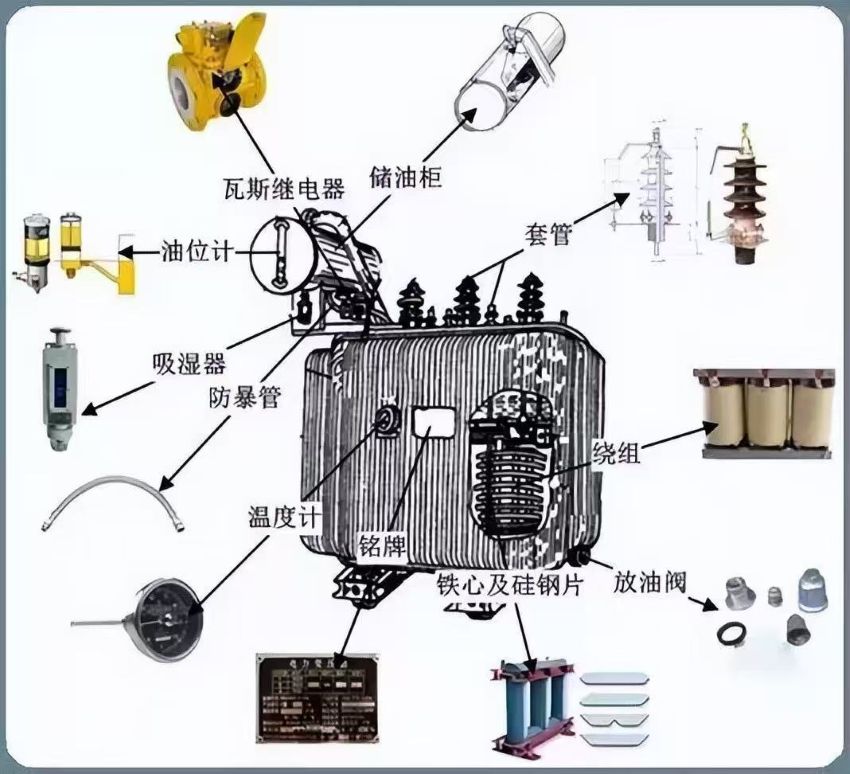 本次小编以油浸式配电变压器进行结构介绍,油浸式配电变压器按其结构可分为本体、储油柜、绝缘套管、分接开关、保护装置等。如下图