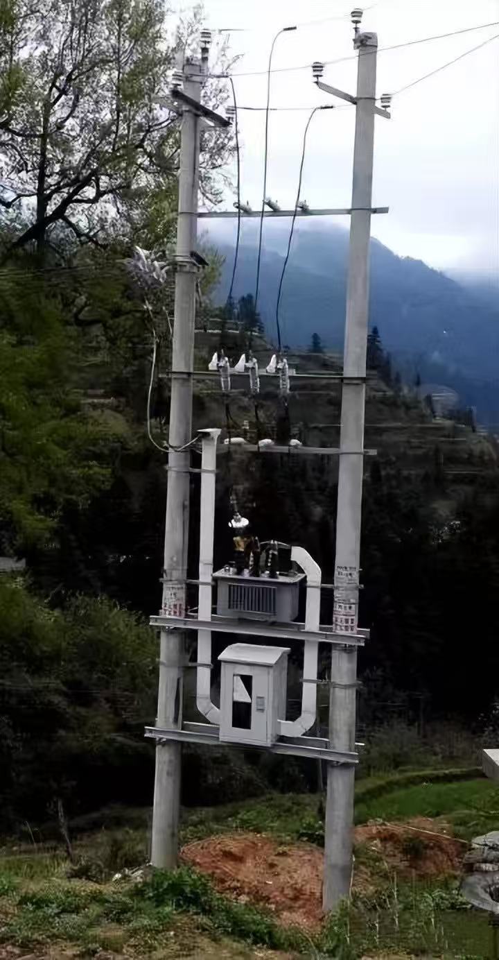 由高压线终端电杆和另一根副杆(长约7.5M)组成。比单柱式坚固,可安装63-315KVA的配电变压器露天落地安装变压器直接放在高度不低于2.5M砖石垒成的台(墩)上。拆装变压器方便,变压器容量不受限制。