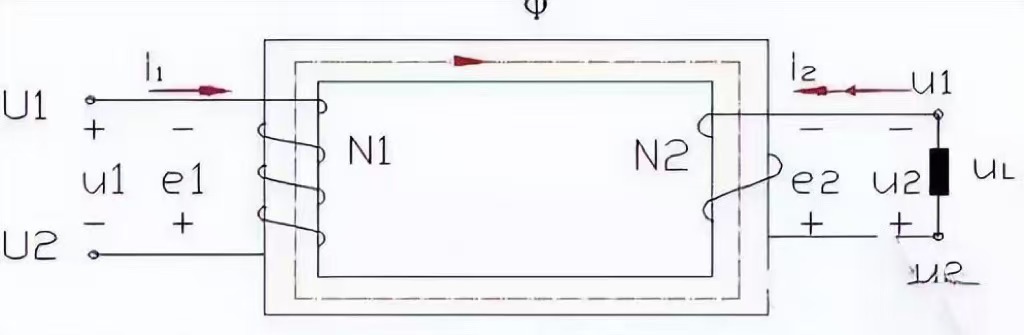 铁心的作用是加强两个线圈间的磁耦合。为了减少铁内涡流和磁滞损耗,铁心由涂漆的硅钢片叠压而成;两个线圈之间没有电的联系,线圈由绝缘铜线(或铝线)绕成。一个线圈接交流电源称为初级线圈(或原线圈),另一个线圈接用电器称为次级线圈(或副线圈)。实际的变压器是很复杂的,不可避免地存在铜损(线圈电阻发热)、铁损(铁心发热)和漏磁(经空气闭合的磁感应线)等,为了简化讨论这里只介绍理想变压器。理想变压器成立的条件是:忽略漏磁通,忽略原、副线圈的电阻,忽略铁心的损耗,忽略空载电流(副线圈开路原线圈线圈中的电流)。例如电力变压器在满载运行时(副线圈输出额定功率)即接近理想变压器情况。